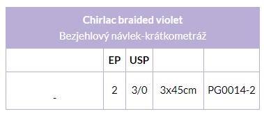 https://www.medplus.cz/chirlac-braided-violet-3-0-ep2-3-x-45-cm-bez-jehly-24-ks-v-baleni/ Vstřebatelné, syntetické, pletené, potahované vlákno fialové barvy vyrobeno z polymeru kyseliny glykolové.Vstřebatelné, syntetické, pletené, potahované vlákno fialové barvy vyrobeno z polymeru kys Podrobný popis
