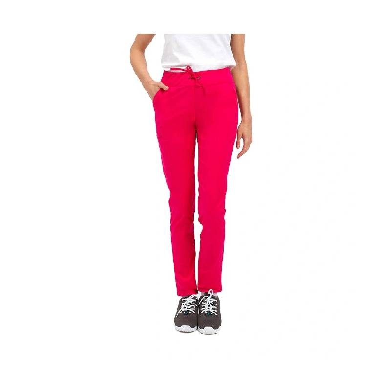 Pohodlné červené zdravotnické kalhoty, vyrobené z tenké, elastické látky s přídavkem spandexu - materiálu s mnoha výhodami.