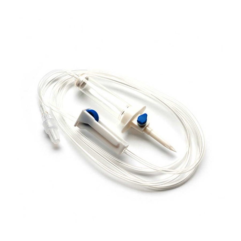 Infuzní souprava k přenosu tekutin v infuzní terapii. 2cestný ostrý napichovací hrot kapací komůrky s protiskluzným povrchem, který zajišťuje těsné a spolehlivé spojení se zásobníky/vaky na tekutiny.